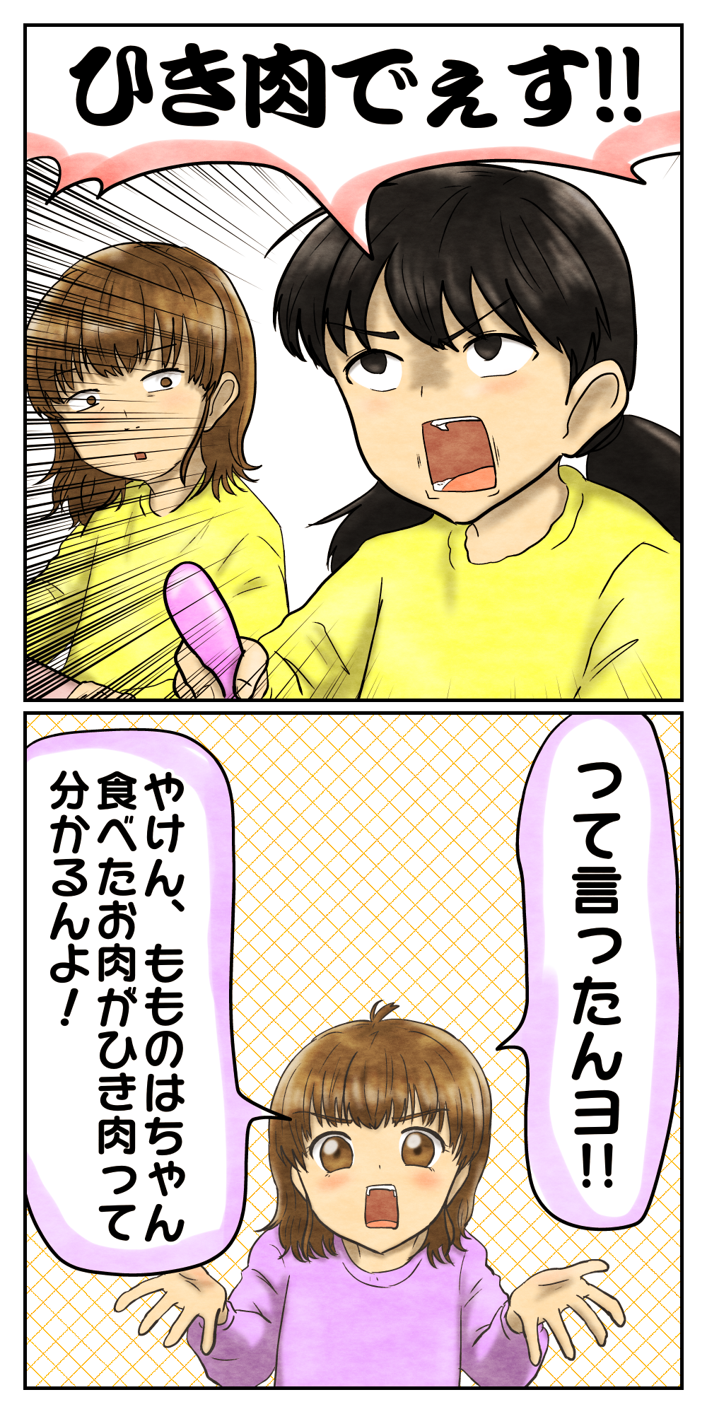 ひき肉でぇす!! 2023年12月04日 07:00 本ページはアフィリエイトプログラムによる収益を得ています 何か最近流行っているらしい、「ひき肉でぇす!!」私お笑いとか疎いし、まともにテレビも見てないから元のネタが分からないけど、インスタとかでちょこちょこネタにされてるからお笑い芸人の流行りの一発芸なのかな?くらいの認識で存在は知ってた。もものはちゃんはぴぴの大切なお友達。ぴぴと仲良くしてくれているお友達が何人かいて、漫画に出てくる「もものはちゃん」はその複数名を一人にまとめた人物です(*^-^*)大切にしたいがあまり悩んだお話▼ 育児絵日記ランキング 「いずの家の日常漫画」カテゴリの最新記事 タグ :#ぴぴ < 前の記事次の記事 > コメント コメントフォーム 名前 コメント 記事の評価 リセット リセット 顔 星 情報を記憶 コメントを投稿する