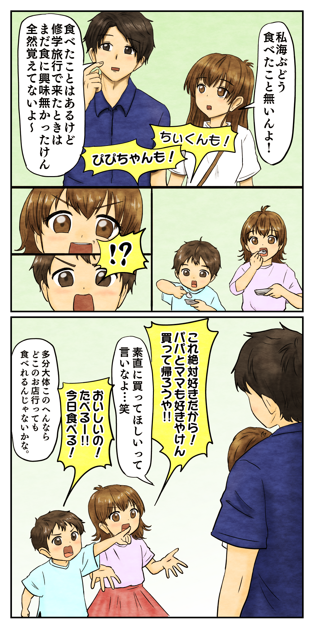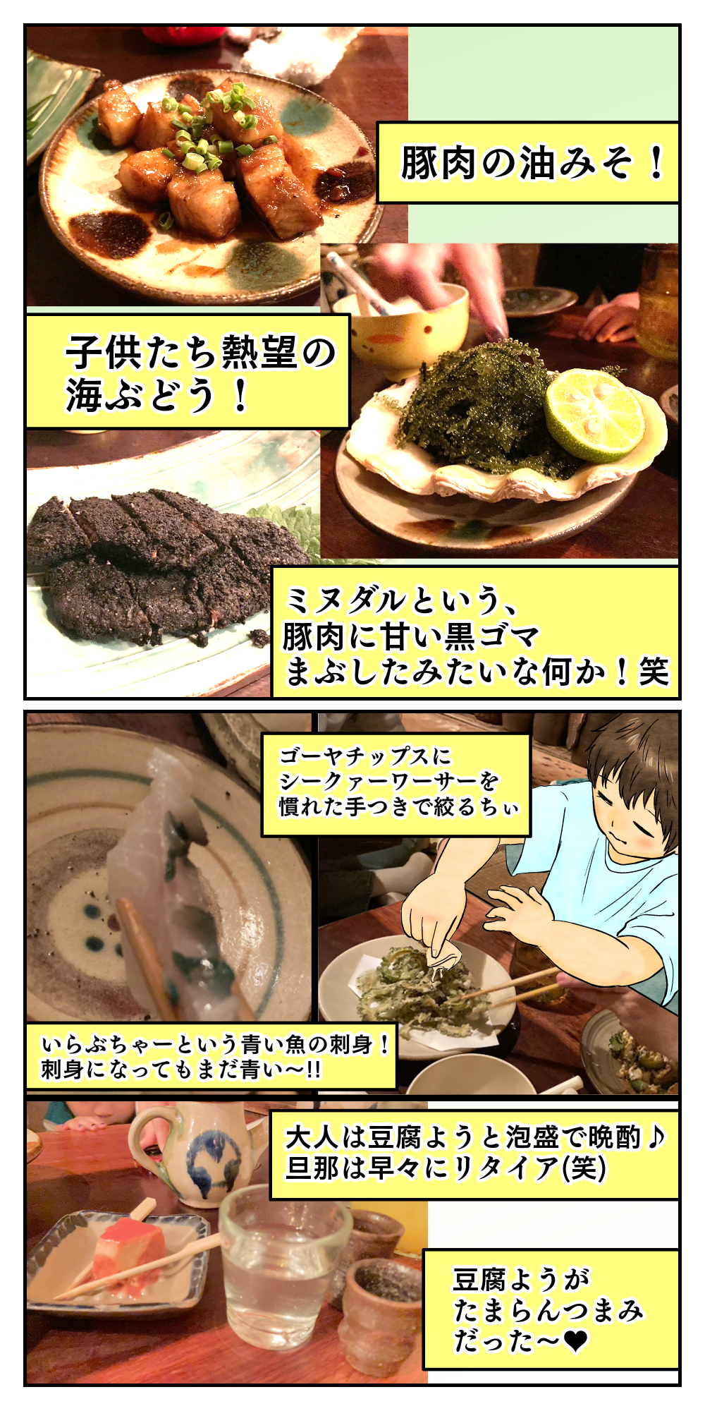 沖縄レポ③~Day1~ 2023年12月13日 07:00 本ページはアフィリエイトプログラムによる収益を得ています 家族で沖縄旅行に行ってきました♪準備や行った場所を含めて、思い出漫画メインでお届けしていきます☆ 前回のお話▼ ちぃが乗り物が好きなので、モノレールに乗ってホテルまで帰るために、駅近くのお店を予約して帰りはモノレール旅も楽しんで帰りました♪沖縄のグルメで私がめっちゃ好きなのはジーマーミー豆腐▼ リンク 最初から▼ 育児絵日記ランキング 「いずの家の日常漫画」カテゴリの最新記事 タグ :#旅行 < 前の記事次の記事 > コメント コメントフォーム 名前 コメント 記事の評価 リセット リセット 顔 星 情報を記憶 コメントを投稿する