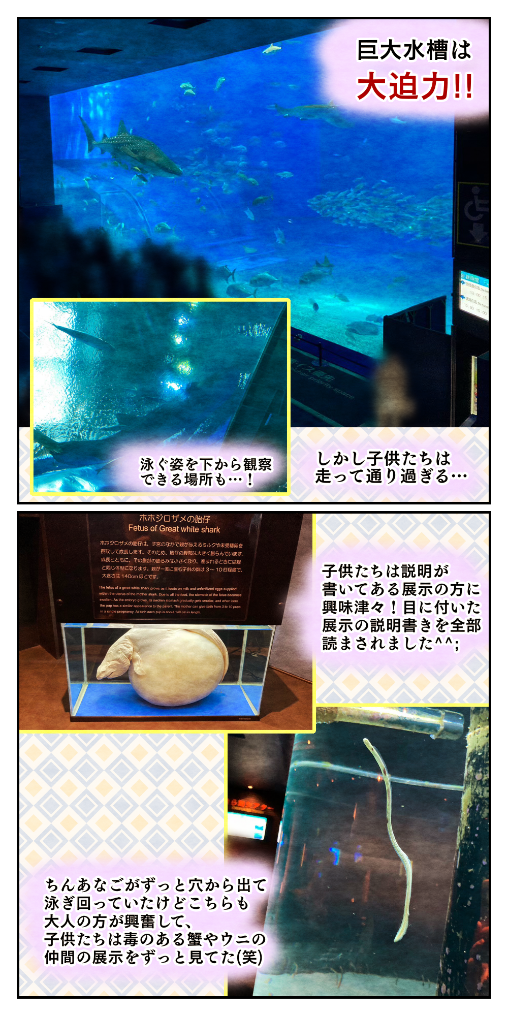 美ら海水族館で子供たちは、意外にもメインの大きな水槽より一つ一つの展示の説明書きの方に興味を持ったよう。