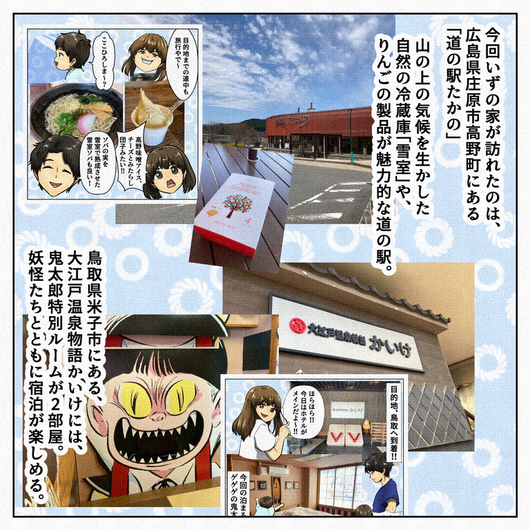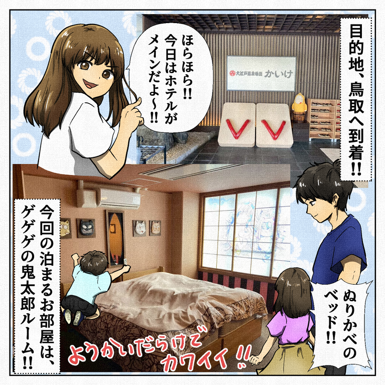 鳥取・島根旅行記~1~ 2025年06月28日 06:00 本ページはアフィリエイトプログラムによる収益を得ています 近いし国内だけど、今までの家族旅行で一番楽しめた鳥取旅行の思い出日記!ふすまから枕返しが出てきたり、ネコ娘の顔が変わったり、お部屋の中だけでたくさんのアトラクションが楽しめるお宿でした!部屋にお風呂が無くて大浴場だけなのですが、(女性はもし月のものがきてたら大変かも…)温泉も入れておいしいご飯もあって、子ども連れには動き回らなくてもホテルでしっかり楽しめるので、大人が疲れることなくちゃんと楽しめました!育児絵日記ランキング 「いずの家の日常漫画」カテゴリの最新記事 タグ :#旅行#家族#すずみ#ぴぴ#ちぃ#K氏 < 前の記事次の記事 > コメント コメントフォーム 名前 コメント 記事の評価 リセット リセット 顔 星 情報を記憶 コメントを投稿する