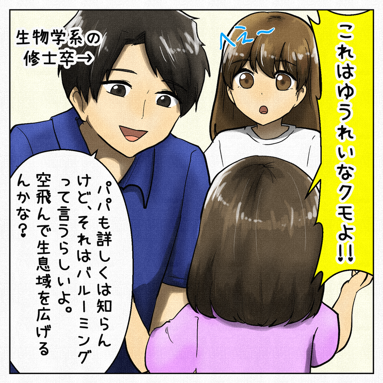 ゆうれいな蜘蛛 2025年09月09日 06:00 本ページはアフィリエイトプログラムによる収益を得ています 蜘蛛の専攻ではないけど、生き物のフシギはとりあえずパパに聞く。子どもの蜘蛛だけがバルーミングで飛ぶ種類の蜘蛛や、成虫になってもバルーミングを行う種もあるようです。私は詳しくないので私のバルーミングの知識はネット情報だけど…^^;育児絵日記ランキング 「いずの家の日常漫画」カテゴリの最新記事 タグ :#ぴぴ < 前の記事次の記事 > コメント コメントフォーム 名前 コメント 記事の評価 リセット リセット 顔 星 情報を記憶 コメントを投稿する
